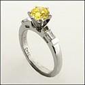 A modern engagement ring with a round canary colored high quality cubic zirconia in a six prong Tiffany style setting with wide baguettes in channel setting.