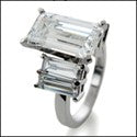 Elegant engagement ring with elongated AAA high quality emerald cut 13x7 cubic zirconia in prong setting, sides have long baguettes.