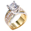 Eye catching , one of a kind engagement ring in two tone. The center stone is AAA high quality chic Asscher that is suspended by prongs. High set.The base band is set with princess cuts in invisible setting in two rows.