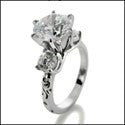 Fancy engagement ring with AAA high quality round center in 6 prong Tiffany setting. Sides have small round stones in prong setting. The shank has an elegant engraving topped with small burnished stones.