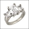 An eye-catching ring with a polished engraved shank and a high quality round emerald cubic zirconia center stone in V prong setting along with princess cubic zirconias in V prong setting on the sides.