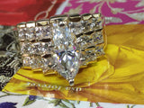 Eye catching 13mm wide band, very heavy shank. Set with AAA high quality marquise center and channel set AAA high quality princess cut stones on the sides.