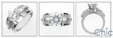 A striking engagement ring with a high polished solid shank and a high quality round diamond cubic zirconia center stone in Tiffany style setting along with princess and baguette shaped diamond cubic zirconias in channel setting on the sides.