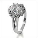 Elegant engagement ring set with AAA high quality round cubic zirconia surrounded by round smaller stones in shared prongs. Split shank.Burnished stones on the base of the ring.
