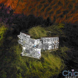 A majestic engagement ring with a high polished solid heavy shank, a high quality AAA princess cut cubic zirconia center stone set in prong tiffany, round pave set stones on the sides and baguette stones set in prong.