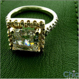 Fancy two-tone ring, set with AAA high quality 3-carat princess cut in prong, surrounded by small round stones in pave setting. The top is in 14K yellow gold, the band is in 14K white gold set with round stones in pave.