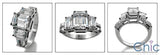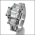 A stylish engagement ring with an emerald cut center stone set in prong and two more on the sides as well as tapered baguette cut cubic zirconias in channel settings on the sides.