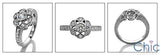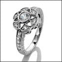 A ravishing engagement ring with an engraved shank. AAA quality round cubic zirconia center stone in bezel surrounded by round stones in pave.