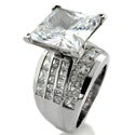 Eye catching engagement ring,set with AAA high quality princess cut center stone in 4 prong setting,elevated sides are set with 2 rows of channel set princess cuts in addition to two more lower rows set with larger princess cuts as well. Heavy, solid shank 14mm wide. Seems as if it is a combination of 1 engagement ring and 2 wedding bands.