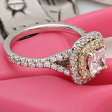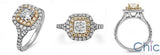 Absolutely gorgeous princess cut cubic zirconia engagement ring. This eye catching cz engagement ring is showcasing a 0.75 carat AAA high quality, IGI certified Princess cut center stone setted in 14k yellow gold prongs. The princess cut center stone cubic zirconia is set in a two tone double halo setting. The halos are jeweled with small round cz stones in pave setting. The split shank has pave set stones as well. The cz engagement ring is made in 14k Two tone solid white and yellow gold. "14K" stamp is inscribed. The 14k white gold has a Rhodium coating.