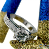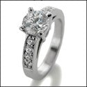 A stylish engagement ring set with AAA high quality round center in prong setting. Sides have small pave set round stones. Solid shank.