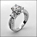 A delightful engagement ring with high polished solid shank, a high quality round cubic zirconia center stone, two smaller round cubic zirconias on each side, and many beautifully set round cubic zirconias in pave settings.