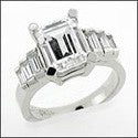 A stylish engagement ring with an emerald cut center stone set in prong and straight baguette cut cubic zirconias in channel settings on the sides.