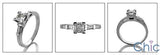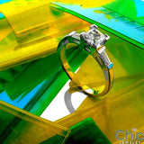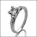 A stylish engagement ring with a high polished solid shank, with a high quality princess cut cubic zirconia center stone set in v prong, and tapered baguettes on the sides.