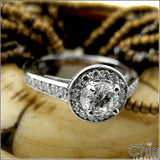 Classy engagement ring set with AAA high quality round stone in prong setting, surrounded by pave set stones, the band seCt ion has pave set stones as well.