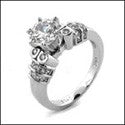 A speCt acular engagement ring with high polished shank, with high quality round cubic zirconia center stone, and round cut cubic zirconias set in pave and bezel setting.