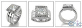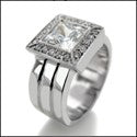 A ravishing engagement ring with high polished solid shank, and AAA high quality cubic zirconia princess cut center stone set in bezel, and with high quality cubic zirconias around the center stone.