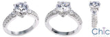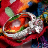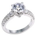 An exquisite engagement ring with high polished solid shank, AAA high quality round center cubic zirconia set in prong setting, with round cubic zirconia diamonds in all direCt ions in pave