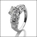 A dazzling engagement ring with a high polished solid shank. AAA quality round cubic zirconia center stone in four prong setting with baguettes in channel and round cubic zirconias in pave.