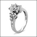 A stunning engagement ring with high polished shank, with high quality cubic zirconia center stone, with high quality round cut cubic zirconias on the sides, and with high quality baguettes cut cubic zirconias in channel setting on the shank.