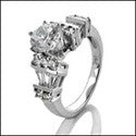 A radiant engagement ring with a high polished solid shank. AAA quality round cubic zirconia center stone in six prong setting, with round stones and tapered baguettes set in channel prong.