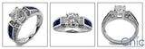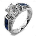 A stylish engagement ring with high polished solid shank, with round cut AAA quality cubic zirconia center stone set in prong setting, and with high quality sapphire cubic zirconia princess cut and diamond color cubic zirconia round cut stones set in channel and pave setting on the sides.