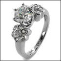 A eye-filling engagement ring with high polished solid shank, with round cut AAA high quality center stone set in 6 prong tiffany setting, and with flower design on the sides are filled with high quality diamond color cubic zirconia stones burnished.