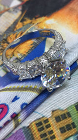 A beautiful gorgeous engagement ring with polished contoured shank, with AAA high quality round cubic zirconia stones set in share prong setting, and with small round cut high quality cubic zirconia stones set in pave setting.