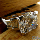 Eye-catching engagement ring with AAA high quality 4 Ct . round center stone, sides have baguettes in channel. Heavy shank.