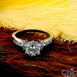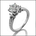 An extremely elegant engagement ring with a high polished shank, with a high quality round cut cubic zirconia center stone in a six prong tiffany setting, with a high quality princess cut cubic zirconia set in prong on each side, and princess cut cubic zirconias set in channel.