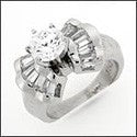 An eye catching tiffany style ring with a center cubic zirconia in a six-prong setting surrounded by tapered baguette cubic zirconias in channel