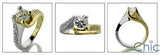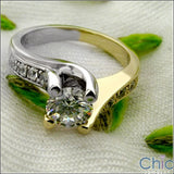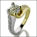 An exquisite two tone classic ring with a round high quality cubic zirconia in channel prong setting in the center and round cubic zirconias in pave setting on the sides..