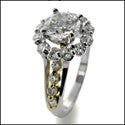 Elegant engagement ring set with AAA high quality round cubic zirconia in four prongs surrounded by round smaller stones in shared prongs. Two tone shank