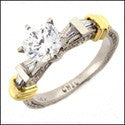 A delicate two tone ring with a solid high polished shank and a round high quality cubic zirconia center stone and baguette cut cubic zirconias on the sides in channel setting.