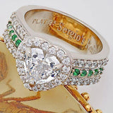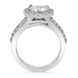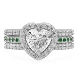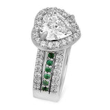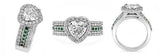 This beautiful Cubic Zirconia Engagement ring is set with AAA high quality, IGI certified 2 carat Heart shape center. The heart shaped center is set in halo style pave set setting. The sides of the shank are set with 3 rows of small round stones, middle row is set with emerald color round stones, that continued like a bridge underneath the heart shape's gallery. Heavy solid shank.Shape