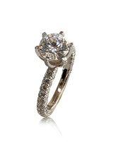 Eye-catching 2 Carat AAA Highest Quality, IGI certified Round Cubic Zirconia Engagement ring. The center stone is set in 6 prong setting. The prong of the ring are jeweled with small round stones . The shank of the ring is almost 3 MM wide. It is set with round stones in 3 rows, top, front and back view of the ring.