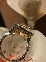 Fancy light canary round 1.25 carat highest quality cubic zirconia engagement ring. This elegant piece demonstrates a double halo set with micro pave tiny stones around the center stone. The center stone and first halo are made in yellow gold. The beautiful gallery underneath displays the filigree in yellow gold. The outer halo and the rest of the ring is made in white gold. The shank of the ring has the eternity symbol that's jeweled by micro pave set round cz stones.