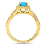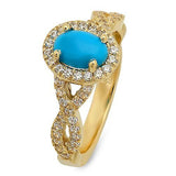 Gorgeous Engagement ring with an oval Turquoise surrounded by small round cz in halo. The shank is showcasing delicate braiding of eternity symbol topped with pave set round cubic zirconia stones. Solid 14k Gold.Perfect gift for people with Sagittarius Zodiac sign.