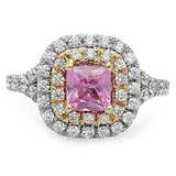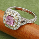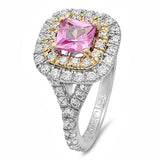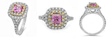 Absolutely gorgeous pink princess cut cubic zirconia engagement ring. This eye catching cz engagement ring is showcasing a 0.75 carat AAA high quality, IGI certified Princess cut center stone set in 14k Rose gold prongs. The princess cut center stone cubic zirconia is set in a two tone double halo setting. The halos around the center stone are jeweled with small round cz stones in pave setting. The split shank has pave set stones as well. The cubic zirconia engagement ring is made in 14k Two tone solid white and rose gold. "14K" stamp is inscribed. The 14k white gold has a Rhodium coating.