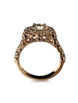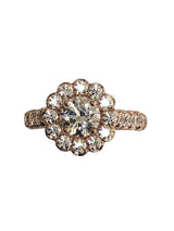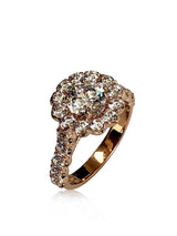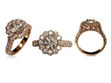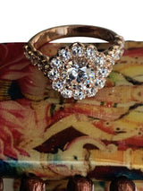 Rose gold cubic zirconia engagement ring. This eye catching cz engagement ring is showcasing a 1.0 carat AAA highest quality, IGI certified round brilliant center stone. The round cubic zirconia is set in prongs in a halo setting. The halo is topped with larger than usual round cz stones in share prong setting. The under gallery has delicate swirls. It's also showcasing a small bezel set round stones from both sides. The cz engagement ring is made in 14k solid rose gold. "14K" stamp is inscribed. Rose gold is also known as Pink gold.