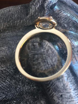 Elegant engagement ring AAA high quality, IGI certified 1.0 carat round brilliant cubic zirconia. The center stone is set in 4 prong halo setting.The halo is topped with small round cubic zirconia stones in pave setting. The shank of the ring is plain with no side stones.The elevated halo will allow for a band sit sit flushed together with the engagement ring. Narrow, dainty band creates a gorgeous contrast with the brilliant round center stones and pave set halo. The ring set is made in solid 14k gold. The "14K" stamp is the proof for the Gold's karat used in making this delicate piece.