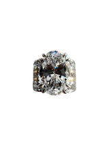 The oval center stone is securely held by double wire prongs in white gold, offering a contemporary twist to a timeless design. Surrounding the main stone, channel-set princess cut stones add a touch of brilliance and sparkle, bringing the total carat weight to an impressive 9.2 CTW.