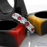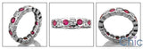 A fascinating eternity ring with polished solid shank, with round cut ruby color cubic zirconias and princess cut diamond color cubic zirconias set in half bezel setting.