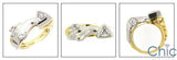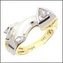 A two tone solid engraved shank ring with a triangle high quality cubic zirconia in bezel setting and round cubic zirconias in bezel setting on the sides.