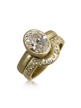 Elegant Engagement ring set with 2.5 carat AAA Highest Quality IGI certified Oval Cubic Zirconia. The center stone is set in bezel setting. The wedding band is fitted to the angles of the engagement ring. The band has round cz stones burnished in the shank. The finish on the ring is called "brushed', hence the metal is not polished to the highest shine and to achieve the matt finish sand blast is applied.