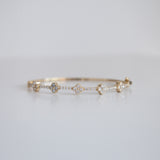 Popular clover bangle bracelet in 14k yellow gold. They are pave set with diamonds and have small bridges in between each clover. 1.75 TCW E color, VVS clarity. The bracelet is secured with reliable lock, offering both beauty and durability.