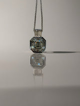 This pendant is a masterpiece of clean lines and modern elegance. Featuring a dazzling 2.5-carat Asscher-cut lab-grown diamond in a protective bezel setting, it radiates brilliance from every angle. Two sleek 4x2mm baguette lab-grown diamonds, channel-set above the center stone, add a refined Art Deco flair.