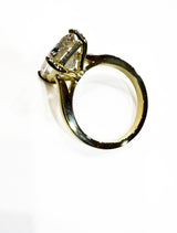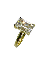 The diamond is secured in distinctive eagle claw prongs, adding both architectural drama and a high-jewelry finish while allowing maximum light to enter the stone. The warm tone of the yellow gold band beautifully contrasts the crisp, icy presence of the emerald-cut diamond, creating a bold yet elegant silhouette.