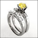 An modern matching band with a round canary colored high quality cubic zirconia in a six prong Tiffany style setting with wide baguettes in channel setting.