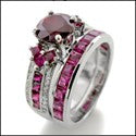 Exquisite design, set with AAA high quality Ruby color round center stone, sides have combination of diamond color pave and ruby color princess cut osntes. Front and back view has a small burnished round stone. Heavy shank.Matching band has ruby color channel set stones